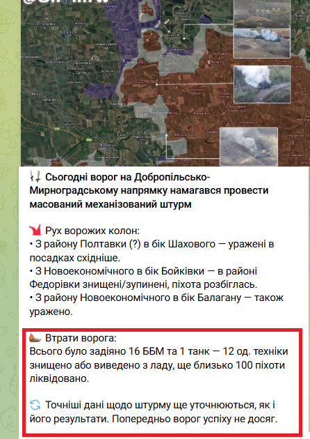 На Покровском направлении наши защитники остановили 65 наступательных действий агрессора в районах населенных пунктов Владимировка, Червоный Лиман, Мирноград, Родинское, Новоукраинка, Новоэкономическое, Балаган, Покровск, Зверево, Котлино, Удачное, Молодецкое, Миролюбовка, Дачное, Филия и в направлении Новопавловки.