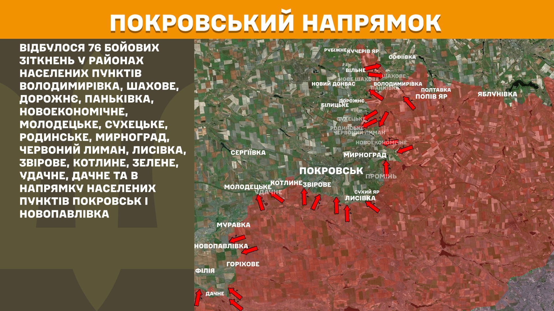 "На Покровском направлении произошло 76 боевых столкновений в районах населенных пунктов Владимировка, Шахово, Дорожное, Паньковка, Новоэкономическое, Молодецкое, Сухецкое, Родинское, Мирноград, Красный Лиман, Лисовка, Зверево, Котлино, Зеленое, Удачное, Дачное и в направлении населенных пунктов Покровск и Новопавловка", - говорится в сообщении.
