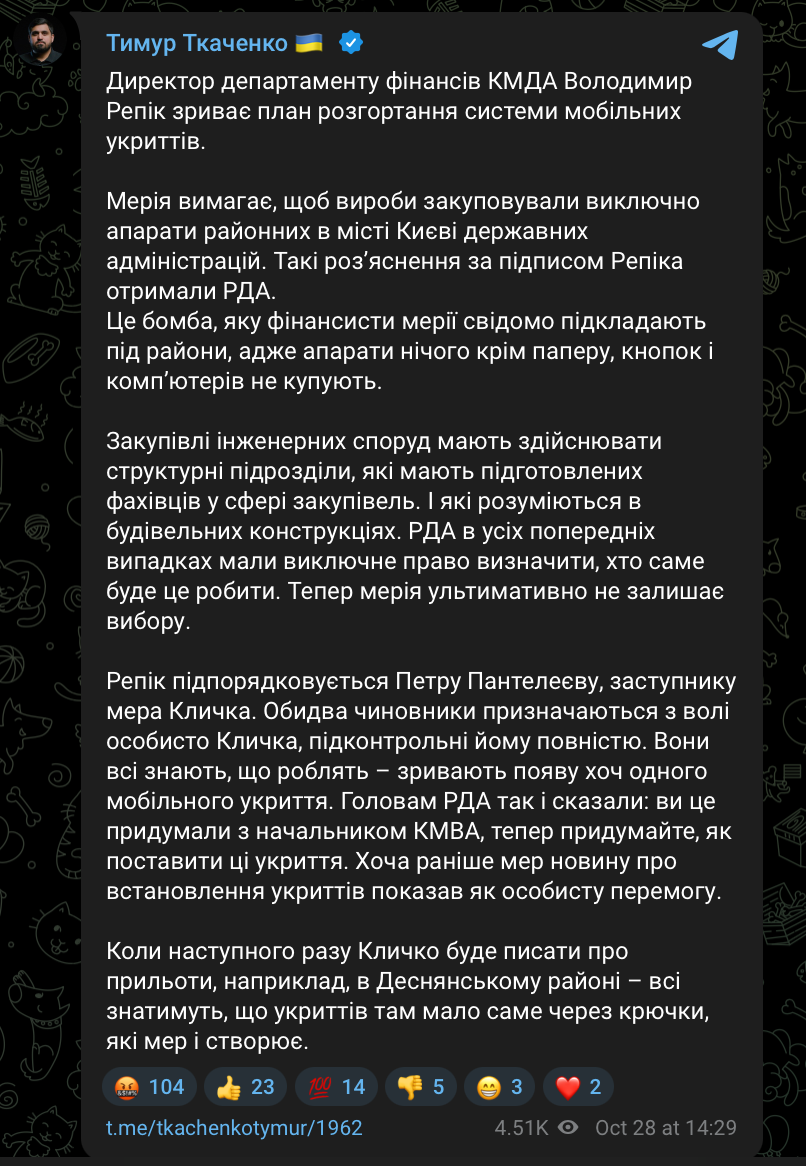 "Репик подчиняется Петру Пантелееву, заместителю мэра Кличко. Оба чиновника назначаются по воле лично Кличко, подконтрольны ему полностью. Они все знают, что делают - срывают появление хоть одного мобильного укрытия. Главам РГА так и сказали: вы это придумали с начальником КГВА, теперь придумайте, как поставить эти укрытия. Хотя ранее мэр новость об установлении укрытий показал как личную победу.