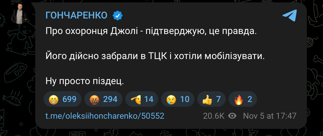 "Представьте лицо ТЦК, когда Анджелина Джоли пришла забирать из "приемки" своего охранника", - отметил он в своем Telegram-канале.