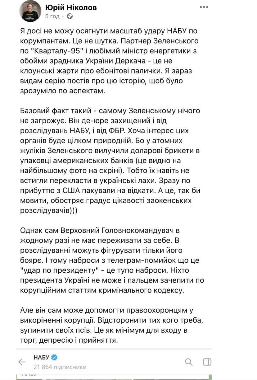 "Я до сих пор не могу осознать масштаб удара НАБУ по коррупционерам. Это не шутка. Партнер Зеленского по "Кварталу-95" и любимый министр энергетики из обоймы предателя Украины Деркача - это не клоунские шутки об эбонитовых палочках. Я сейчас выложу серию постов об этой истории, чтобы было понятно по аспектам. Базовый факт таков - самому Зеленскому ничего не угрожает. Он де-юре защищен и от расследований НАБУ, и от ФБР. Хотя интерес этих органов будет вполне естественным. Потому что у атомных жуликов Зеленского изъяли долларовые брикеты в упаковке американских банков (это видно на самом большом фото на скрине). То есть их даже не успели переложить в украинские лахи. Сразу по прибытии из США упаковывали на откаты. А это, так сказать, обостряет градус интереса заокеанских следователей", - написал журналист.