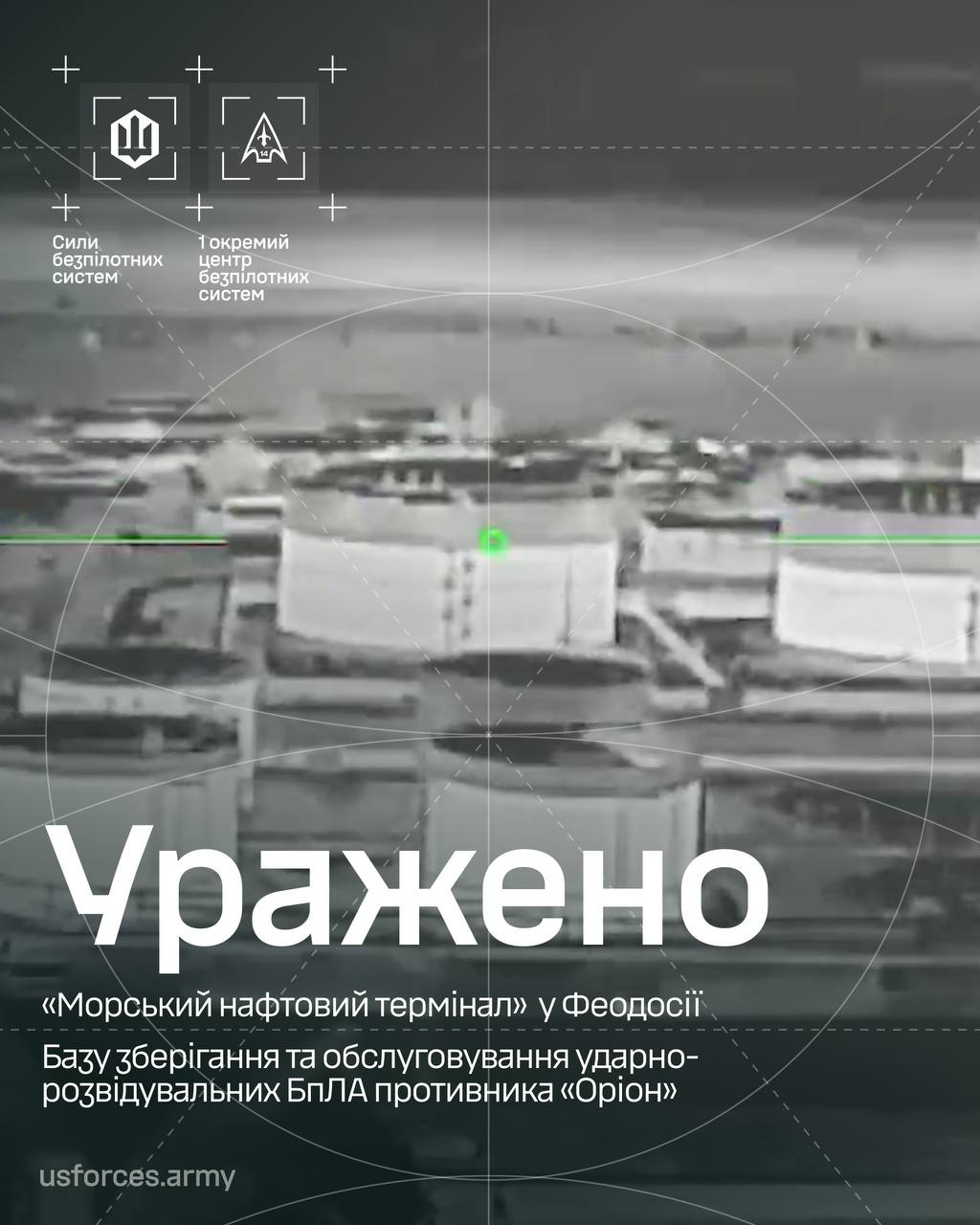 В ночь на 13 ноября операторы 1-го отдельного центра Сил беспилотных систем (бывшего 14-го отдельного полка БпАК) нанесли удары по стратегическим объектам противника во временно оккупированном Крыму. Поражены нефтетерминал в Феодосии и база дронов "Орион" в Кировском.