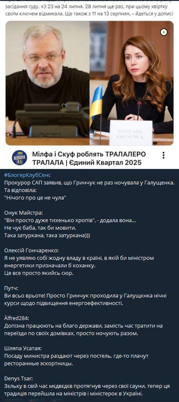 9. У Вищому антикорупційному суді під час засідання зачитали дані з протоколу візуального спостереження, де йшлося, що Гринчук «щонайменше тричі» ночувала у Галущенка. Міністерка енергетики Світлана Гринчук заперечила, що знає щось про те, як вона кілька разів ночувала у міністра юстиції Германа Галущенка.