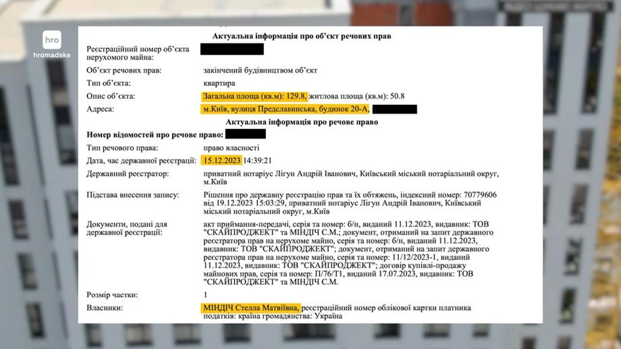 Квартиры Стелла Миндич покупала у застройщика ЖК — ООО "СКАЙПРОДЖЕКТ". Компания принадлежит Александру Глимбовскому — тестю экс-главы ГФС Романа Насирова", — отметили авторы материала.