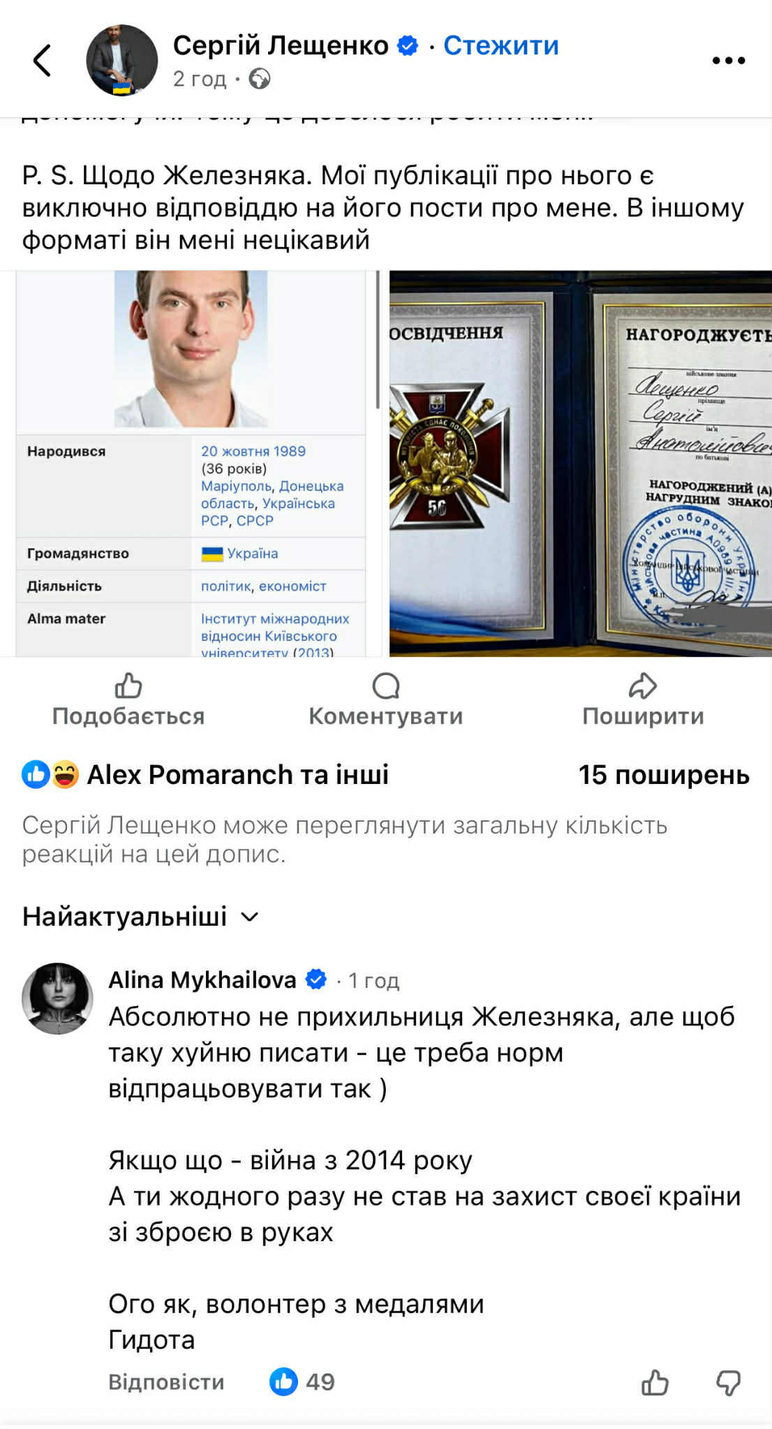 Ого как, волонтер с медалями. Мерзость", - написала Михайлова под постом Лещенко.