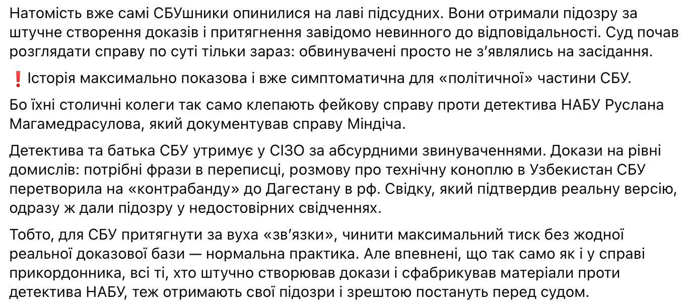 То есть, для СБУ притянуть за уши "связи", оказывать максимальное давление без какой-либо реальной доказательной базы — нормальная практика. Но уверены, что так же, как и в деле пограничника, все те, кто искусственно создавал доказательства и сфабриковал материалы против детектива НАБУ, тоже получат свои подозрения и в конце концов предстанут перед судом", - говорится в сообщении.