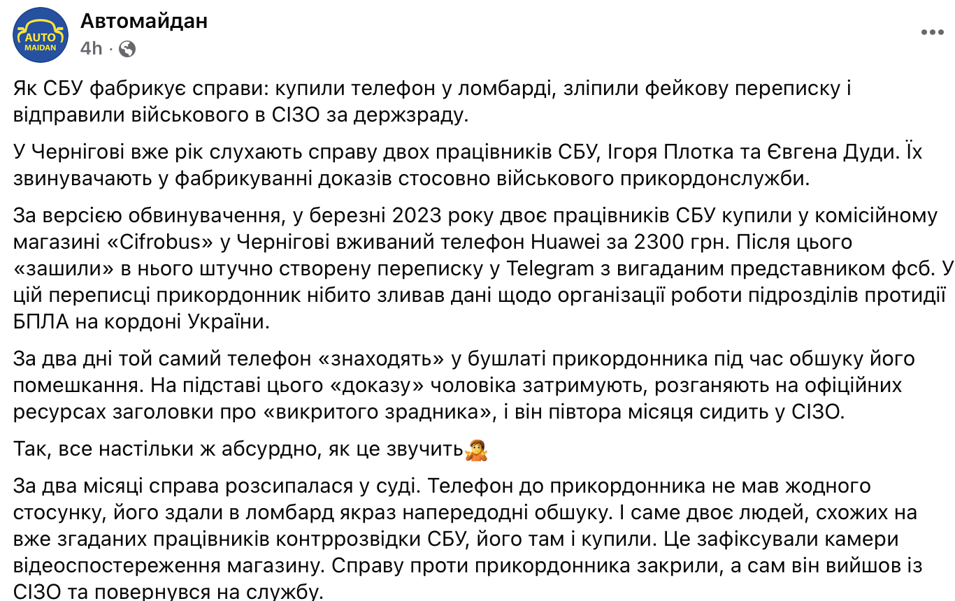 "За два месяца дело рассыпалось в суде. Телефон к пограничнику не имел никакого отношения, его сдали в ломбард как раз накануне обыска. И именно два человека, похожих на уже упомянутых сотрудников контрразведки СБУ, его там и купили. Это зафиксировали камеры видеонаблюдения магазина. Дело против пограничника закрыли, а сам он вышел из СИЗО и вернулся на службу", - пишут в "Автомайдане".