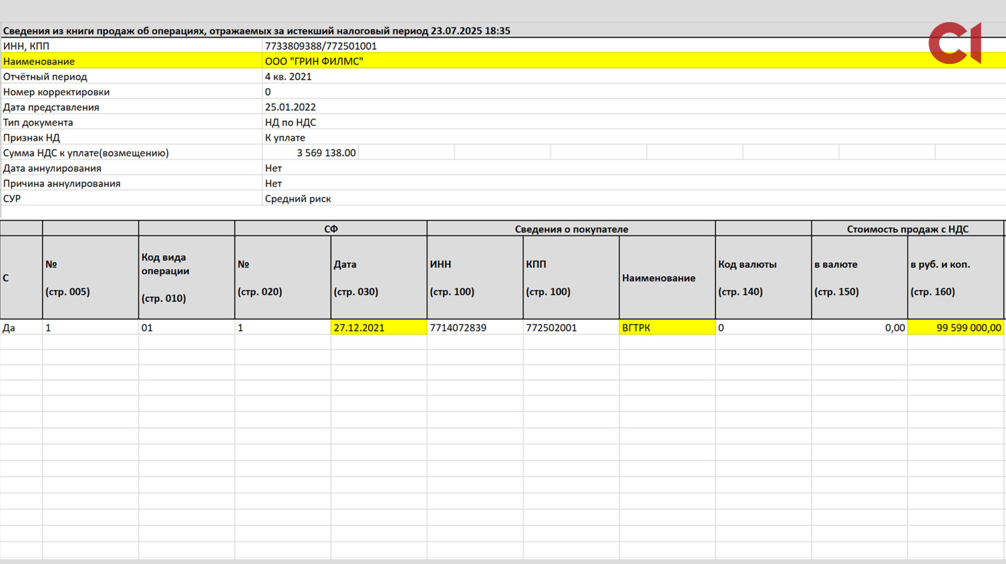 Журналисты "Слідтсво.Інфо" получили документы от источника в российской налоговой, в которых говорится, что 27 декабря 2021 года ВГТРК перечислила 99 599 000 рублей ООО "Грин Филмс".