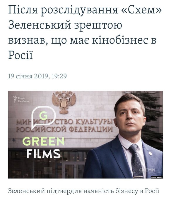 Так, в январе 2019 года проект "Радіо Свобода" "Схеми" опубликовал расследование. В нем говорилось о том, что Владимир Зеленский сказал неправду во время интервью журналисту Дмитрию Гордону, что после 2014 года он вместе с партнерами закрыл бизнес в России.