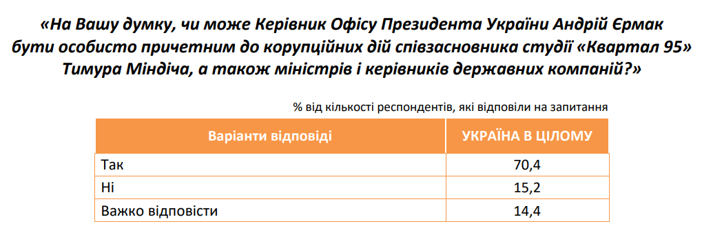 Так, 70,4% опрошенных считают, что Ермак может быть лично причастен к коррупционным действиям, связанным с Тимуром Миндичем, министрами и руководителями государственных компаний.