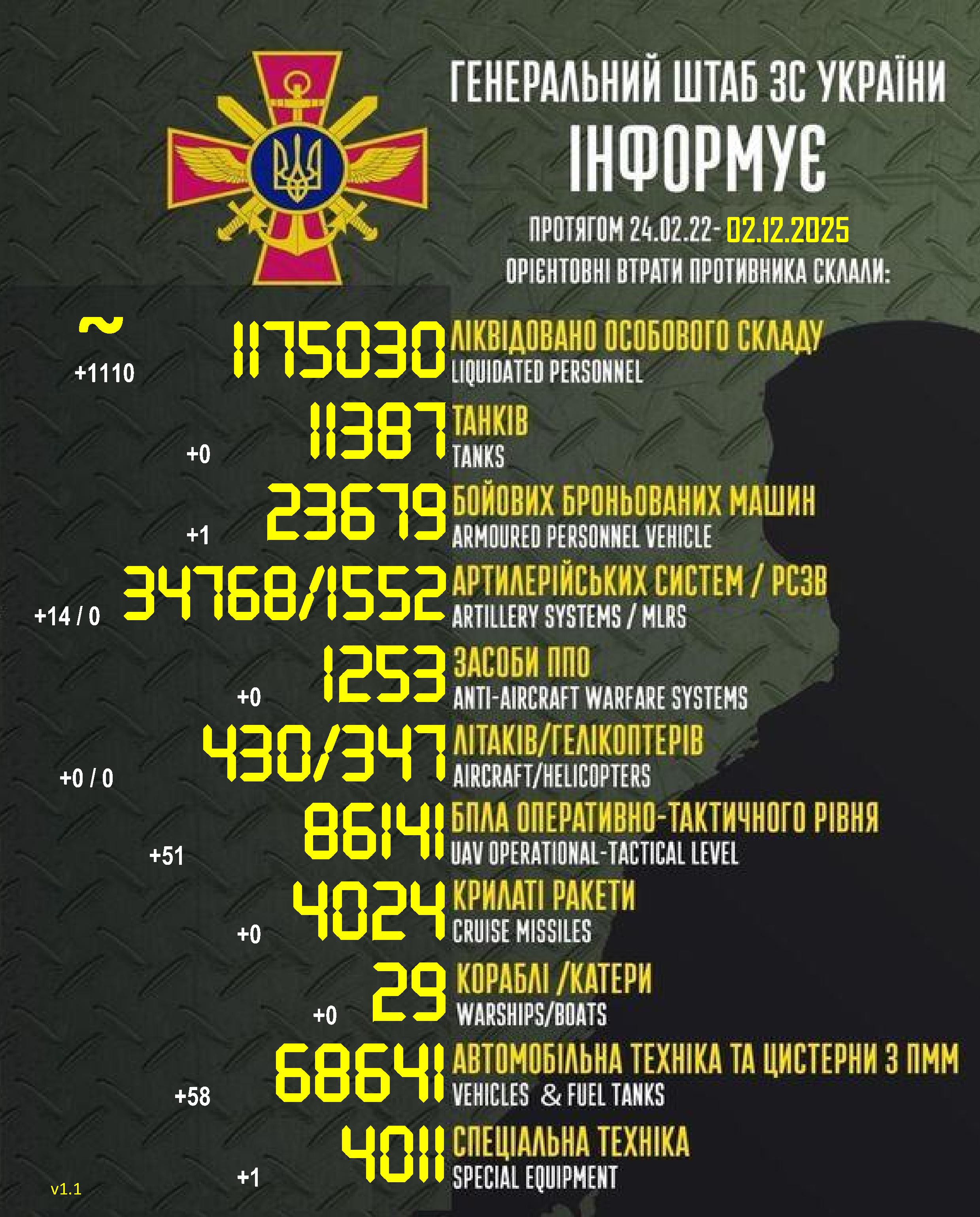 Как отмечается, общие боевые потери РФ с 24.02.22 по 2.12.25 ориентировочно составляют: