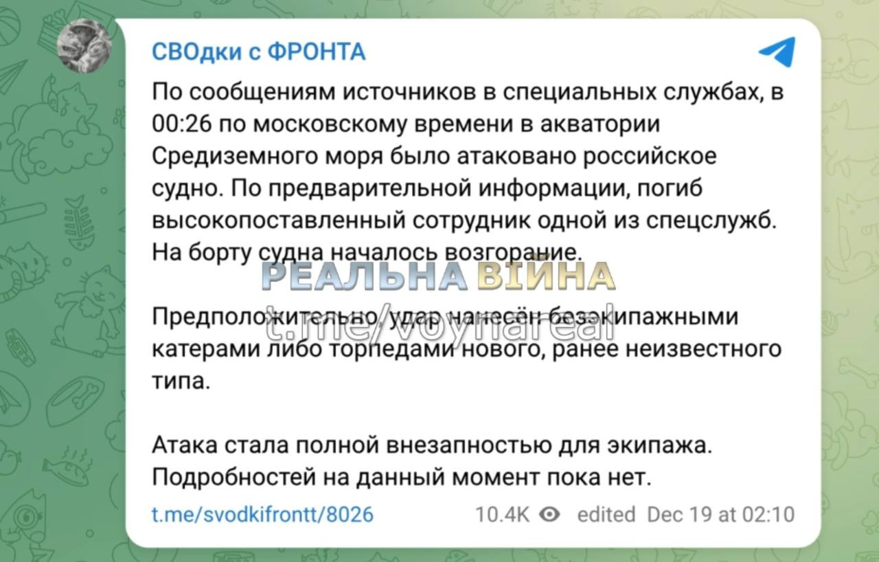 Ймовірно жирна ціль була ліквідована на борту танкера - йдеться про голову військової розвідки генерала ГРУ Андрія Авер'янова з декількома заступниками. Ця особа була відповідальною за тіньові угоди та шпигунство в країнах ЄС, а також саботаж і вибухи, що відбувалися за наказом путіна.
