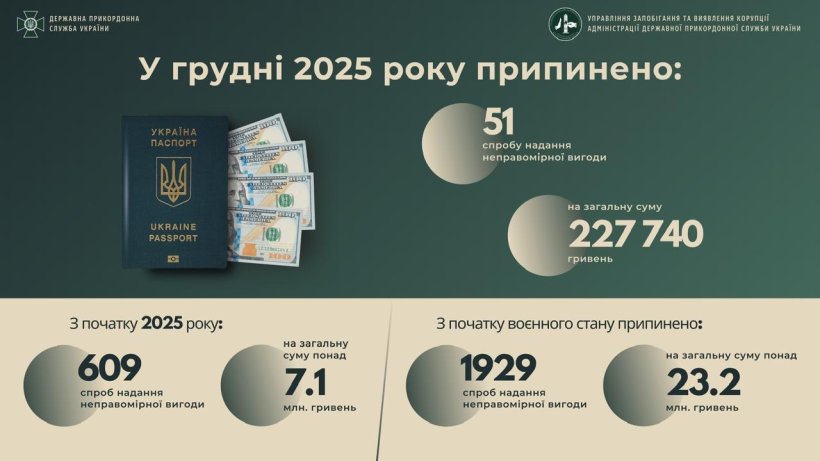 В декабре 2025 года пограничники пресекли 51 попытку предоставления неправомерной выгоды на общую сумму 227,5 тысяч гривен.