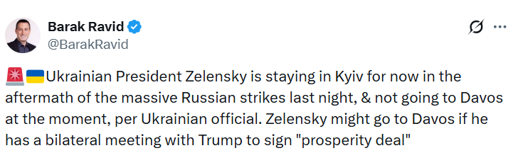 "Президент Украины Зеленский пока остается в Киеве после массированных российских ударов прошлой ночью и пока не едет в Давос, по словам украинского чиновника", - пишет он.