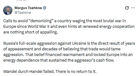 Цахкна напомнил, что полномасштабная война России против Украины является прямым следствием политики умиротворения и десятилетий веры в то, что торговля обуздает агрессию.