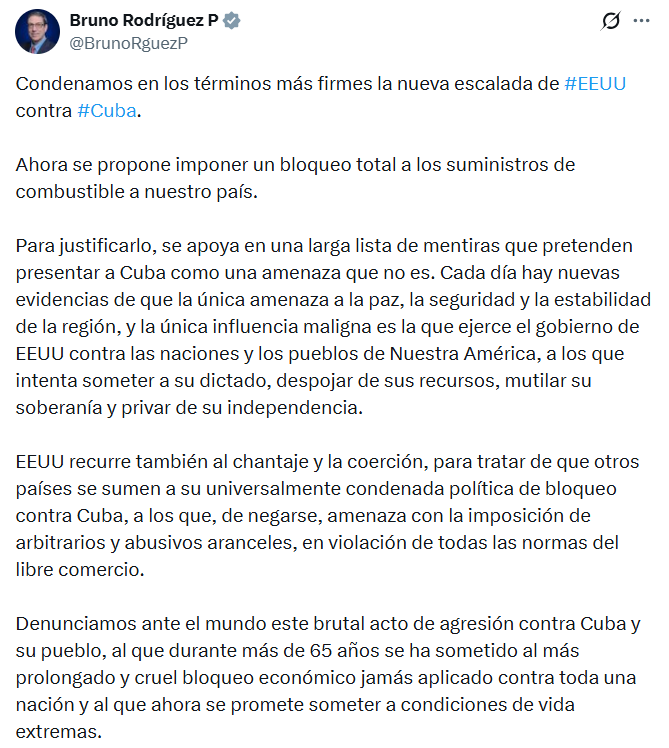"Мы самым решительным образом осуждаем новую эскалацию США против Кубы. Теперь они намерены ввести полную блокаду поставок топлива в нашу страну. Чтобы оправдать это, они опираются на длинный список лжи, пытаясь представить Кубу как угрозу, которой она не является.