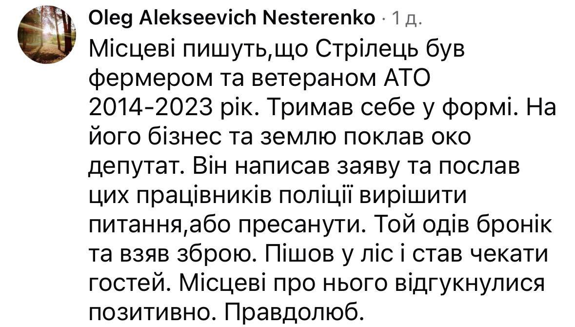 Однако он забаррикадировался и не шел на контакт. Поэтому полицейские пригласили к общению его побратимов. В это время - и именно эти минуты стали критически важными - он незаметно покинул территорию домовладения и устроил засаду у дороги в лесистой местности", - отметил Выговский.