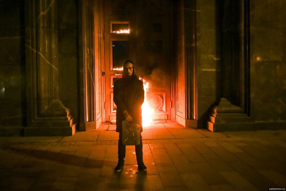 Как сообщает телеканал Дождь, около 2:00 ночи он подошел к зданию ФСБ на Лубянке, облил входную дверь из канистры и поджог ее зажигалкой. Практически сразу же на место прибыли сотрудники полиции, которые задержали художника и присутствовавших журналистов, передает Цензор.НЕТ.