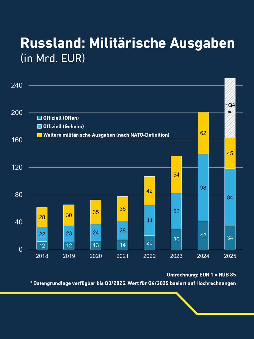 "Комплексный анализ BND бюджетных данных показывает, что реальный военный бюджет России в последние годы был на 66% больше, чем официально заявлялось. Неучтенные расходы касаются, например, строительных проектов министерства обороны, армейских ИТ-проектов или социальных выплат для военнослужащих.