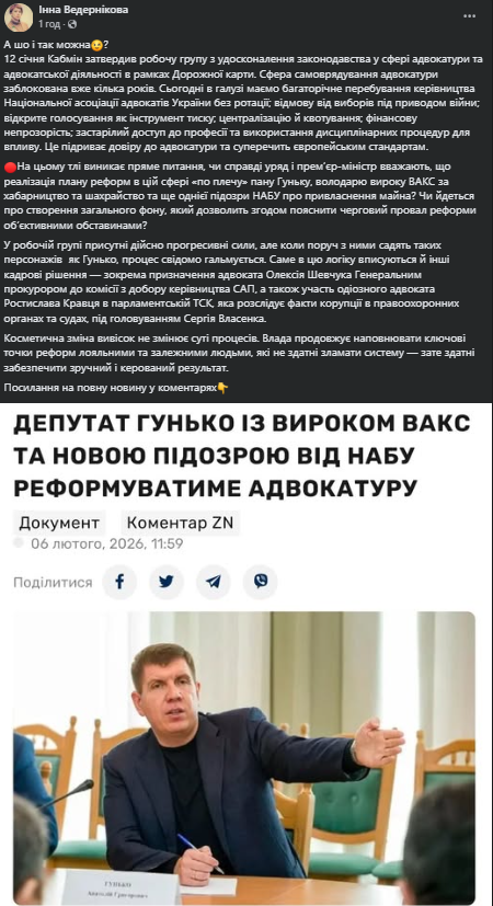 Журналистка Ведерникова о рабочей группе по реформе адвокатуры: "Действительно ли реализация плана "по плечу" господину Гунько?"