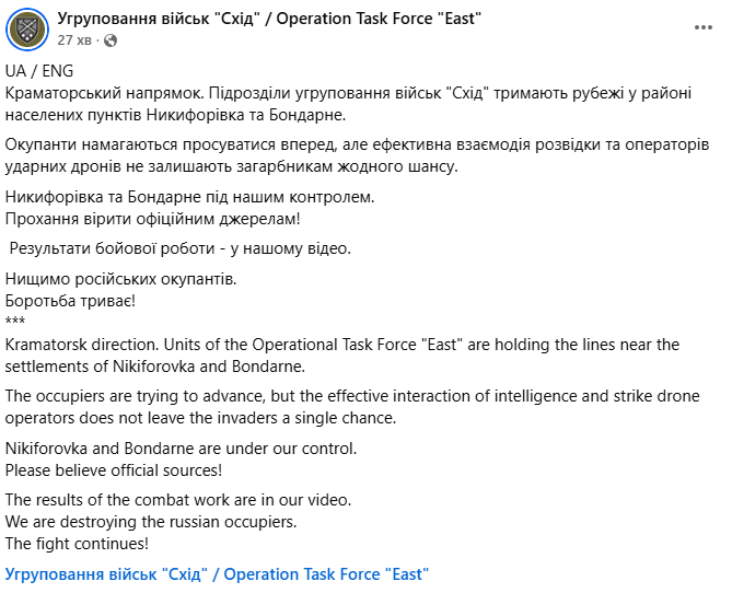 "Никифоровка и Бондарное - под нашим контролем. Просьба верить официальным источникам!" - подчеркнули там.