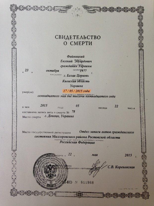 Найти мужчину родные так и не смогли, а потом получили из РФ подтверждение того, что он умер еще в мае 2015 года. Свидетельство о смерти Евгения Файницкого выдано Отделом записи актов гражданского состояния Миллеровского района Ростовской области РФ, а местом смерти значится город Донецк Донецкой области.