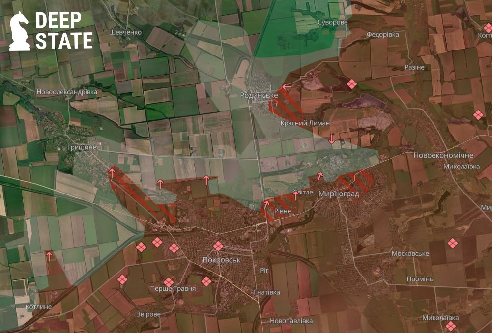 "Закрепление в этом районе дает возможность противнику осуществлять накопление для дальнейшего продвижения в глубину перешейка между Покровском и Родинским, что увеличивает риск для остатков группировки Сил обороны на окраинах Мирнограда. Сам Мирноград поглощается противником. История его обороны подходит к концу", - констатируют аналитики.