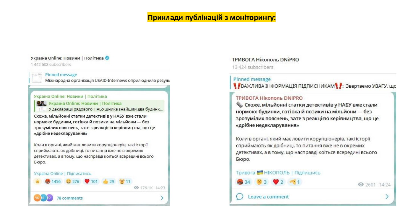 В НАБУ отметили, что об этом свидетельствует синхронность появления - одинаковые сообщения появляются в разных Telegram-каналах почти одновременно.