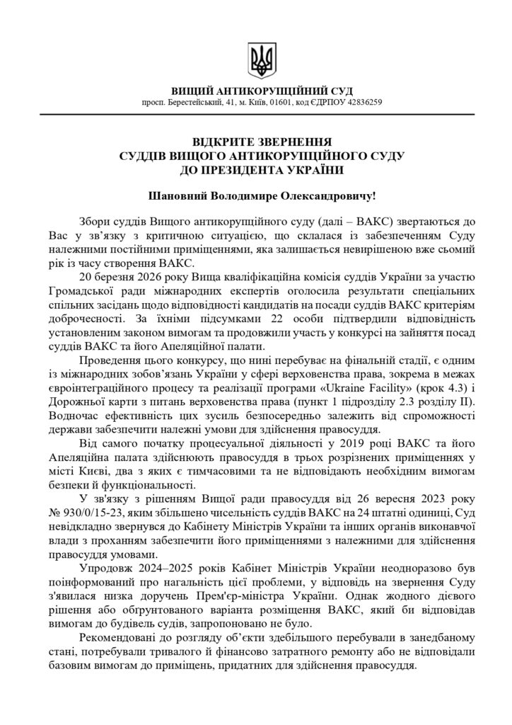 Судьи Высшего антикоррупционного суда обратились к президенту Зеленскому с просьбой решить вопрос об обеспечении суда надлежащим постоянным помещением для отправления правосудия.