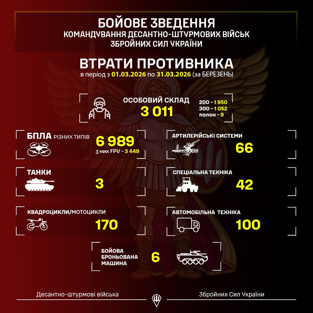 В марте 2026 года Десантно-штурмовые войска ВС Украины значительно усилили интенсивность нанесения ударов по противнику. Показатели потерь РФ существенно выросли по сравнению с предыдущими месяцами.