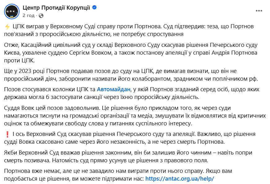 Центр по борьбе с коррупцией выиграл в Верховном суде дело против российского агента Портнова. Суд подтвердил, что утверждение о его причастности к пророссийской деятельности не требует опровержения.