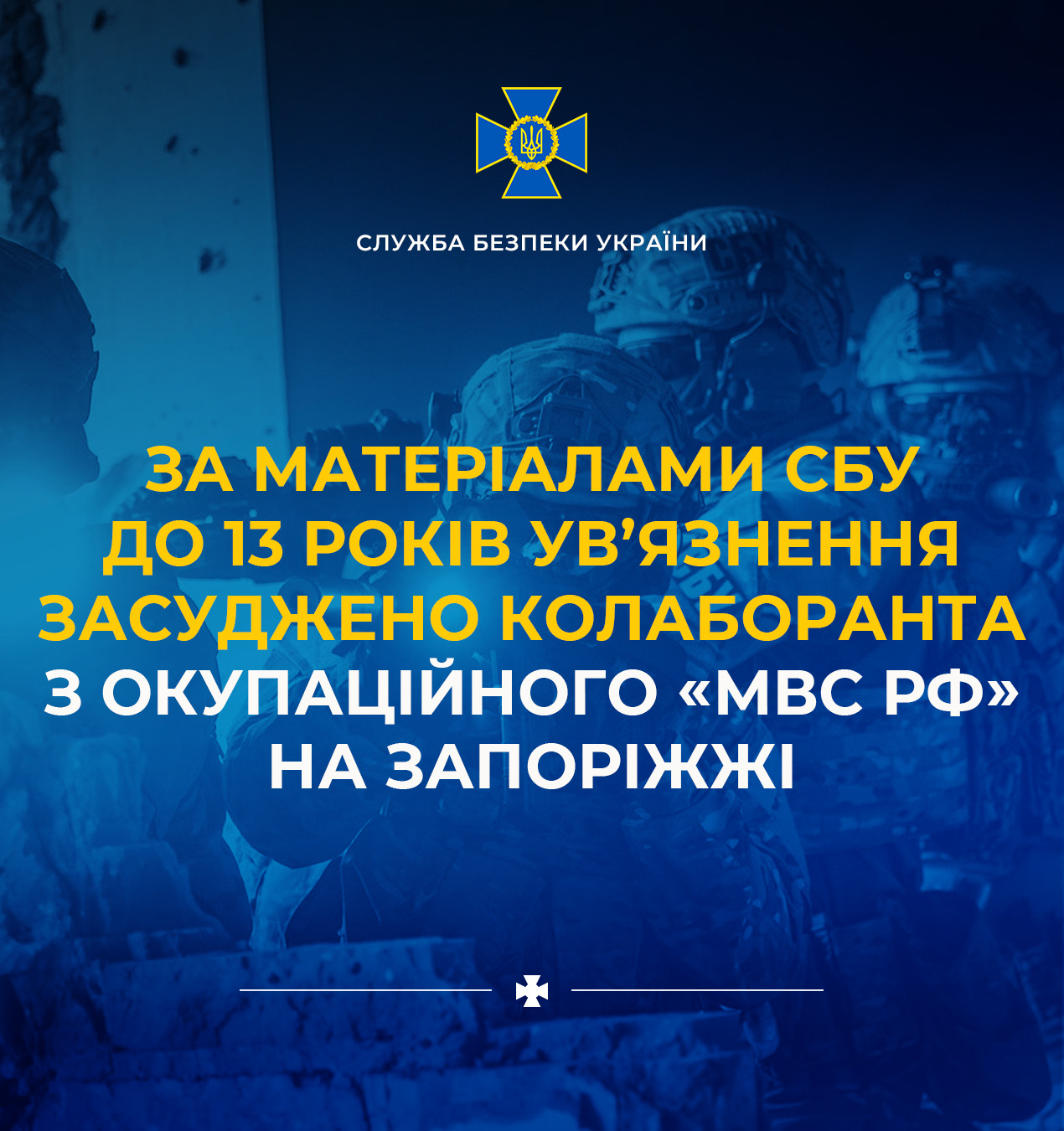 На основании доказательной базы Службы безопасности 13 лет лишения свободы получил коллаборант, работавший на врага в рядах оккупационного "МВД РФ" на временно захваченной территории Запорожской области.