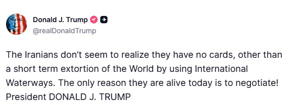 "Иранцы, похоже, не понимают, что у них нет никаких козырей, кроме краткосрочного шантажа всего мира с помощью международных водных путей. Единственная причина, по которой они сегодня живы, – это переговоры!", – заявил президент США.