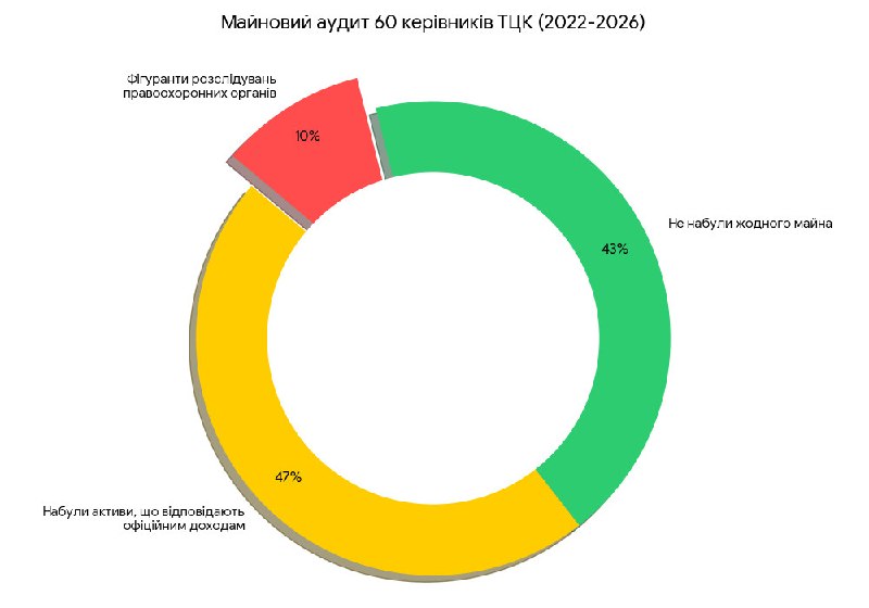 Большинство бывших и нынешних руководителей областных ТЦК и СП — 29 человек (47 % от общего числа) — за время войны приобрели активы в пределах своих доходов. Еще 27 человек (43%) не приобрели никакого имущества за время полномасштабного вторжения, тогда как лишь 6 человек (10%) стали фигурантами уголовных расследований, в частности, по факту незаконного обогащения.