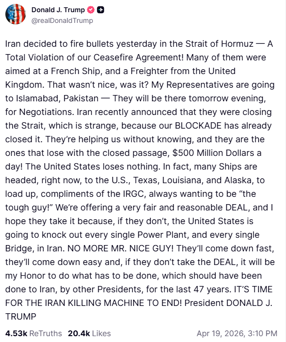 "Недавно Иран объявил о закрытии пролива, что странно, ведь наша БЛОКАДА уже его закрыла. Они помогают нам, сами того не зная, и именно они теряют от закрытого прохода - 500 миллионов долларов в день! Соединенные Штаты ничего не теряют. На самом деле многие суда сейчас направляются в США - в Техас, Луизиану и Аляску - чтобы загрузиться, благодаря КВИР, который всегда хочет быть "крутым парнем"!" - подчеркнул президент США.
