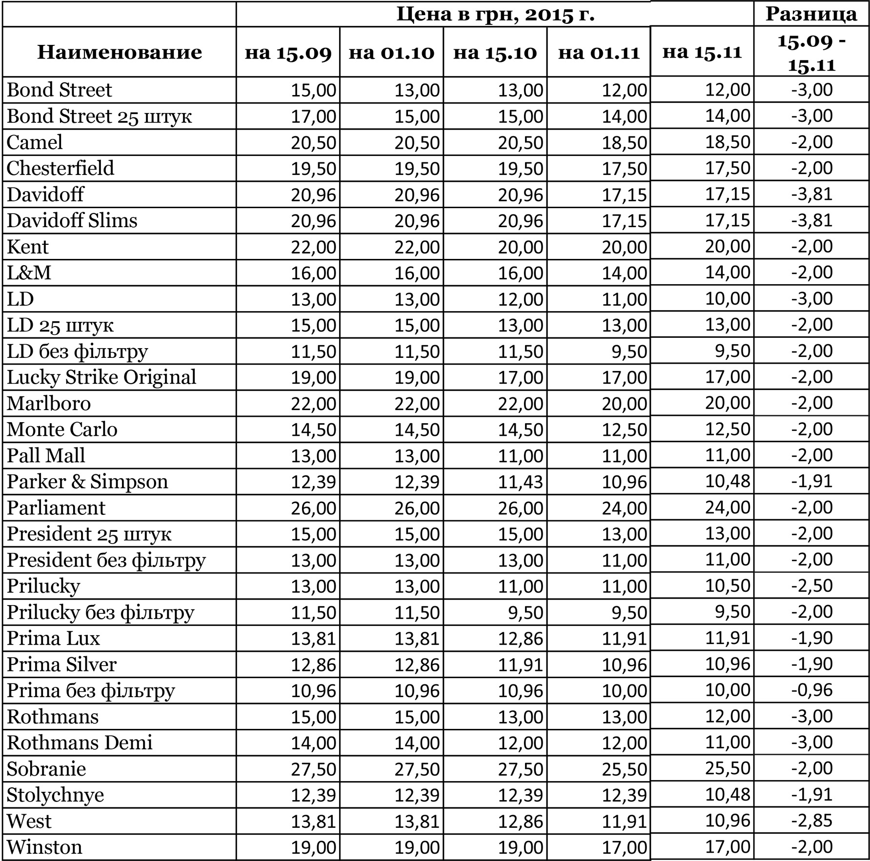 По данным Государственной фискальной службы Украины, за последние два месяца максимальные розничные цены на сигареты упали на 2-3 грн. Это происходит на фоне значительного удорожания всех видов товаров и услуг, сообщает "ДС".По данным Государственной службы статистики Украины, за период с начала текущего года по октябрь, цены в Украине выросли в среднем на 39,5%. А за год (с октября 2014г. по октябрь 2015г.) рост цен составил 46,4%.