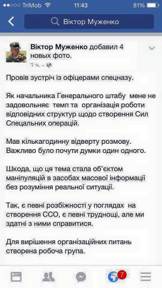 Также он информирует, что на этой встрече присутствовал Сергей Кривонос, которого Муженко всеми силами пытается выжить из сил специальных операций.