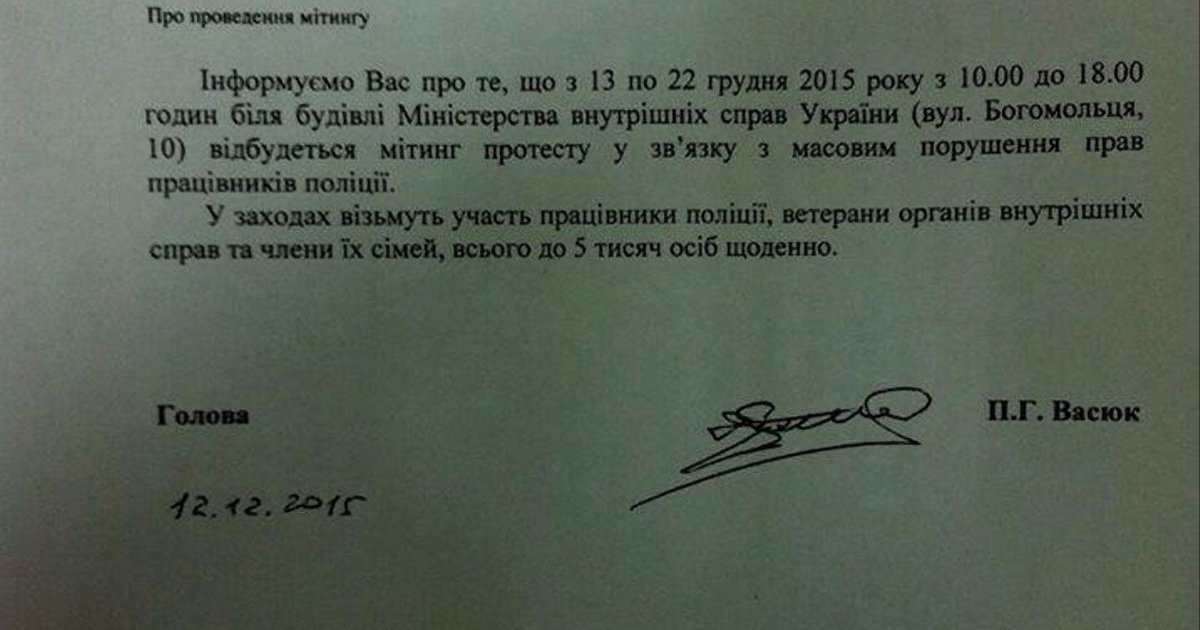 "В связи с этим, с 13 по 22 декабря 2015 с 10 до 18 часов у здания МВД Украины (ул. Богомольця, 10) будут проходить митинги Профсоюза аттестованных работников ОВД. Кроме того, к мероприятию присоединились члены семей сотрудников милиции и ветераны МВД. В общем, мероприятие поддерживает более 10 000 человек", - отметили в заявлении профсоюза.