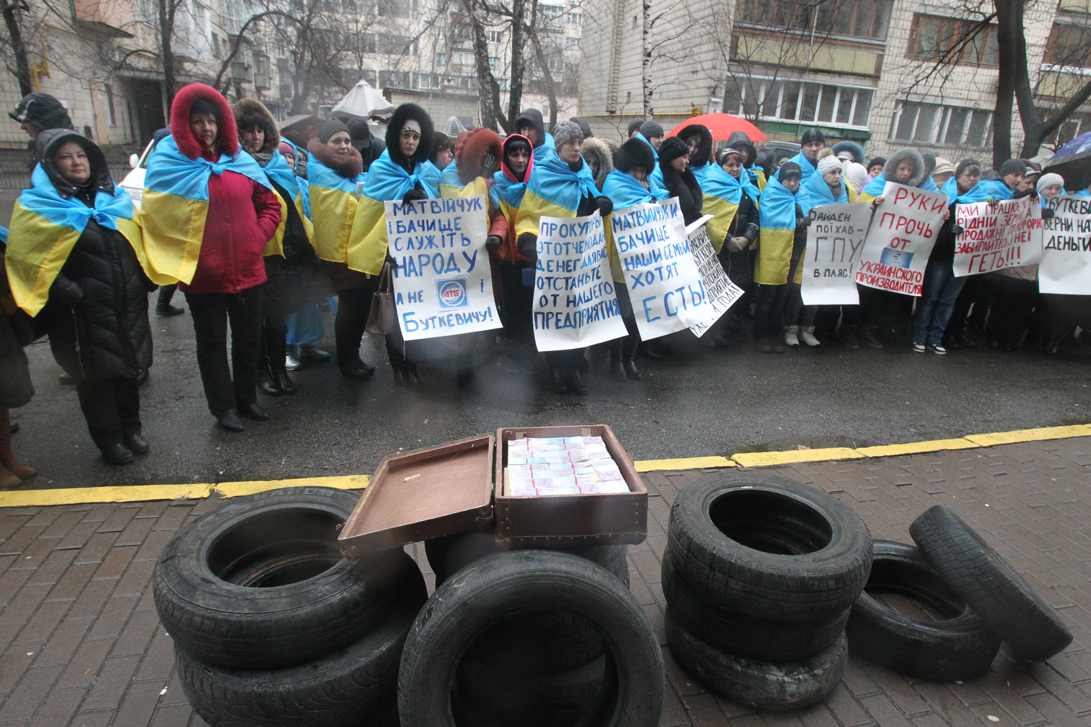 Под зданием Генеральной прокуратуры Украины в Киеве снова появились шины, их привезли с собой участники пикета - сотрудники группы компаний S.Group, которые требовали прекратить коррупционную деятельность прокуратуры Днепропетровской области и лично прокурора области Виктора Матвийчука.