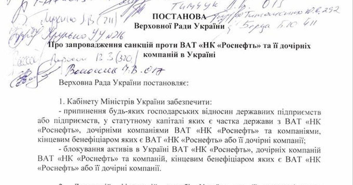 Проект опубликован на странице Чорновол в Фейсбуке."Я лично сегодня регистрирую проект постановления ВР по внедрению санкций против "Роснефти". И буду добиваться, чтобы это постановление было проголосовано в ВР", - сообщила депутат.