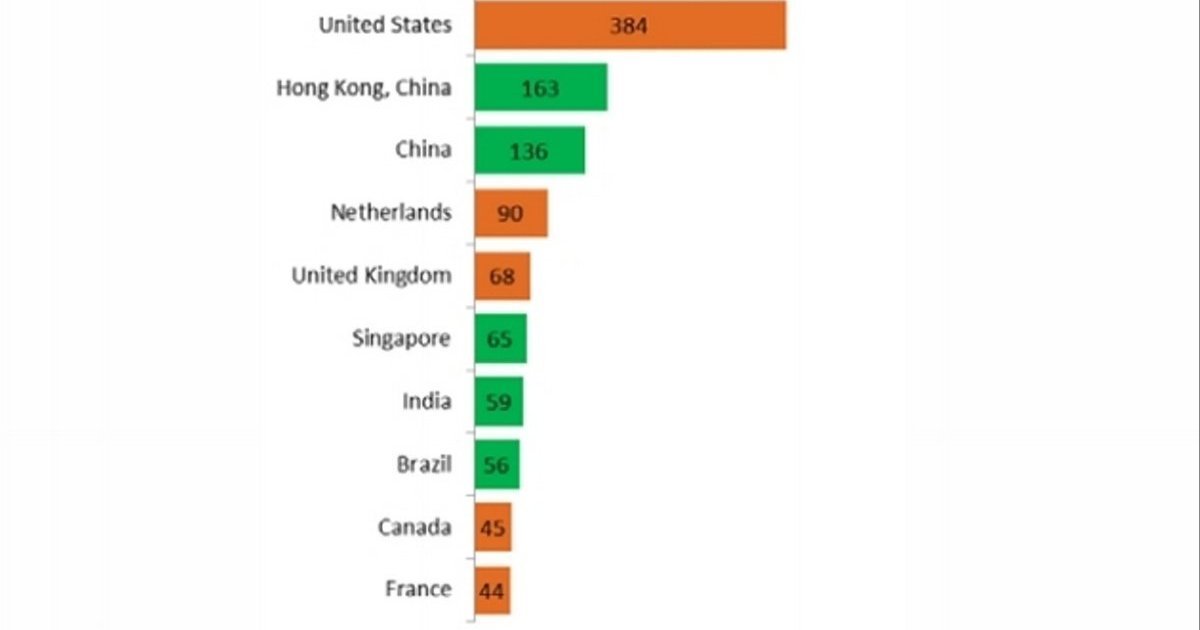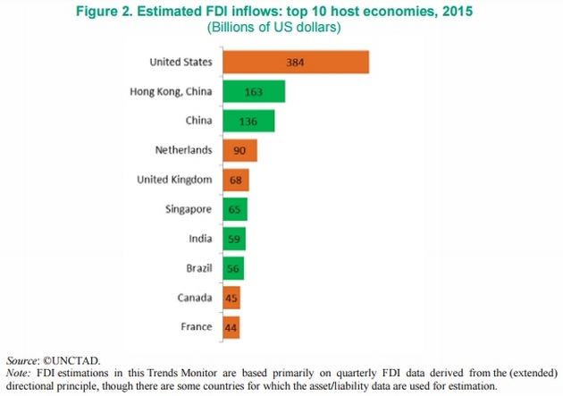 Наибольший приток инвестиций отмечается в США - около $384 млрд. За американцами в списке инвестиционных лидеров следуют Гонконг ($163 млрд) и Китай ($136 млрд), ниже которых расположились Нидерланды, Великобритания, Сингапур, Индия, Бразилия, Канада и Франция.