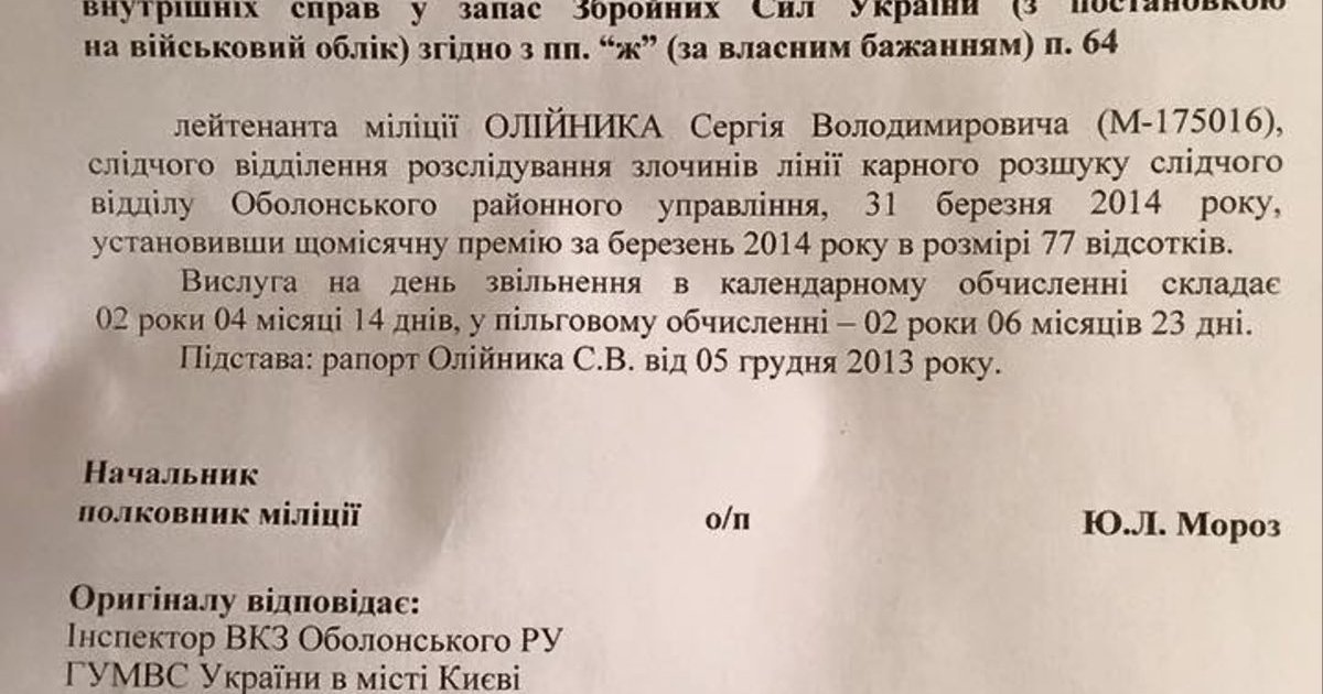 Как сообщает Цензор.НЕТ, об этом заявил народный депутат от "Народного фронта" Антон Геращенко на своей странице в Facebook.По его словам, Олийнык во времена Майдана работал в Оболонском райотделе Киева и 5 декабря 2013 года написал рапорт об увольнении по собственному желанию.