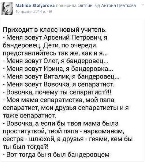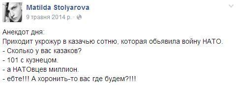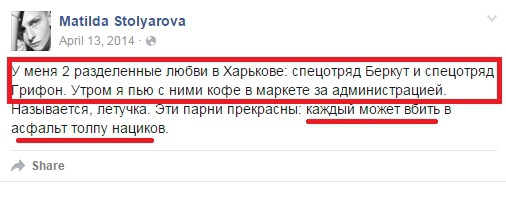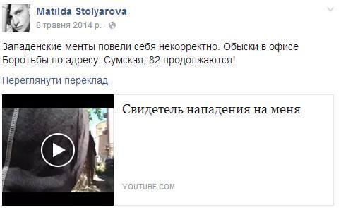 Во-вторых в том же аккаунте под именем Матильда Столярова регулярно публиковались и другие заявления антиукраинского характера, а также оскорбления патриотически настроенных граждан Украины.