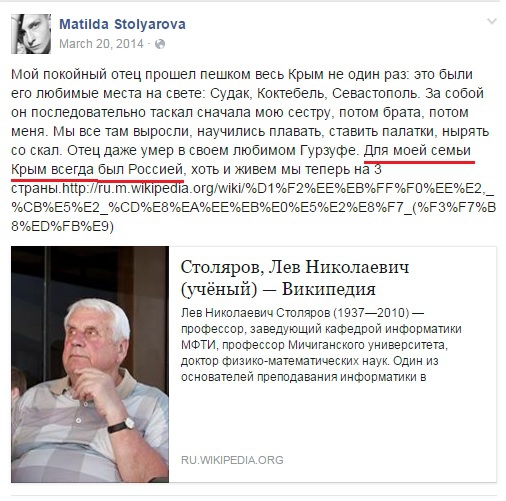 Так весной 2014 года Столярова заявила, что "для моей семьи Крым всегда был Россией".