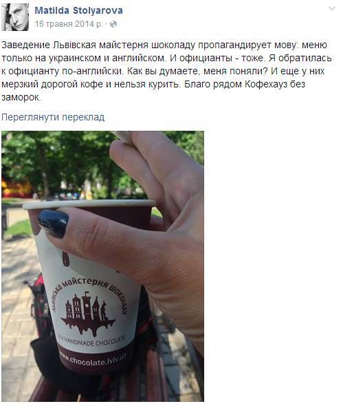 Столярова возмущается "пропагандой мовы" в кафе "Львівська майстерня шоколаду".