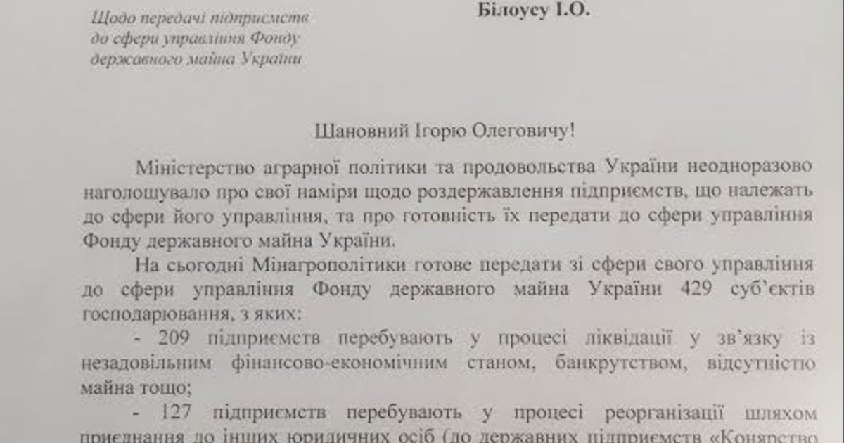 В письме также отмечается, что для обеспечения мероприятий по ликвидации, реорганизации и приватизации предприятий АПК, передача ГП возможна с учетом передачи необходимого количества работников Минагрополитики.