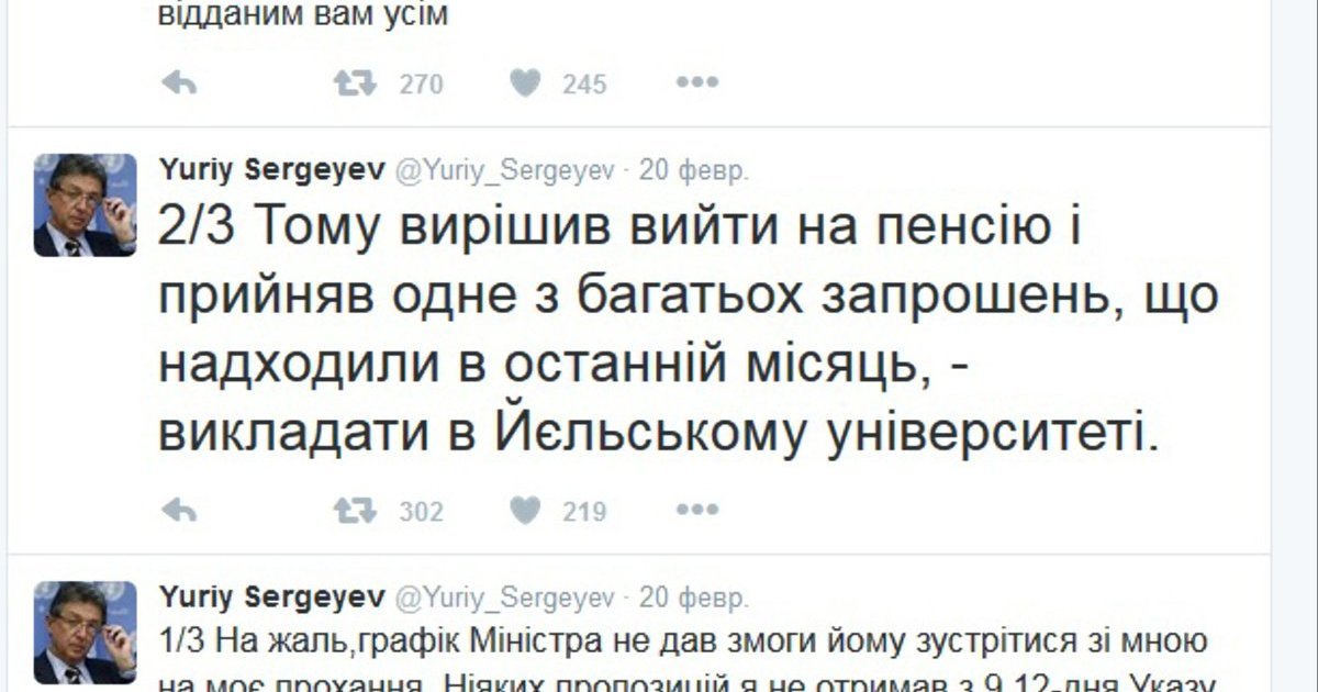 Он отметил, что после увольнения с поста представителя Украины в ООН в декабре 2015 года не получал предложений о трудоустройстве от МИД Украины. По словам Сергеева, министр Павел Климкин не нашел времени для встречи с ним.