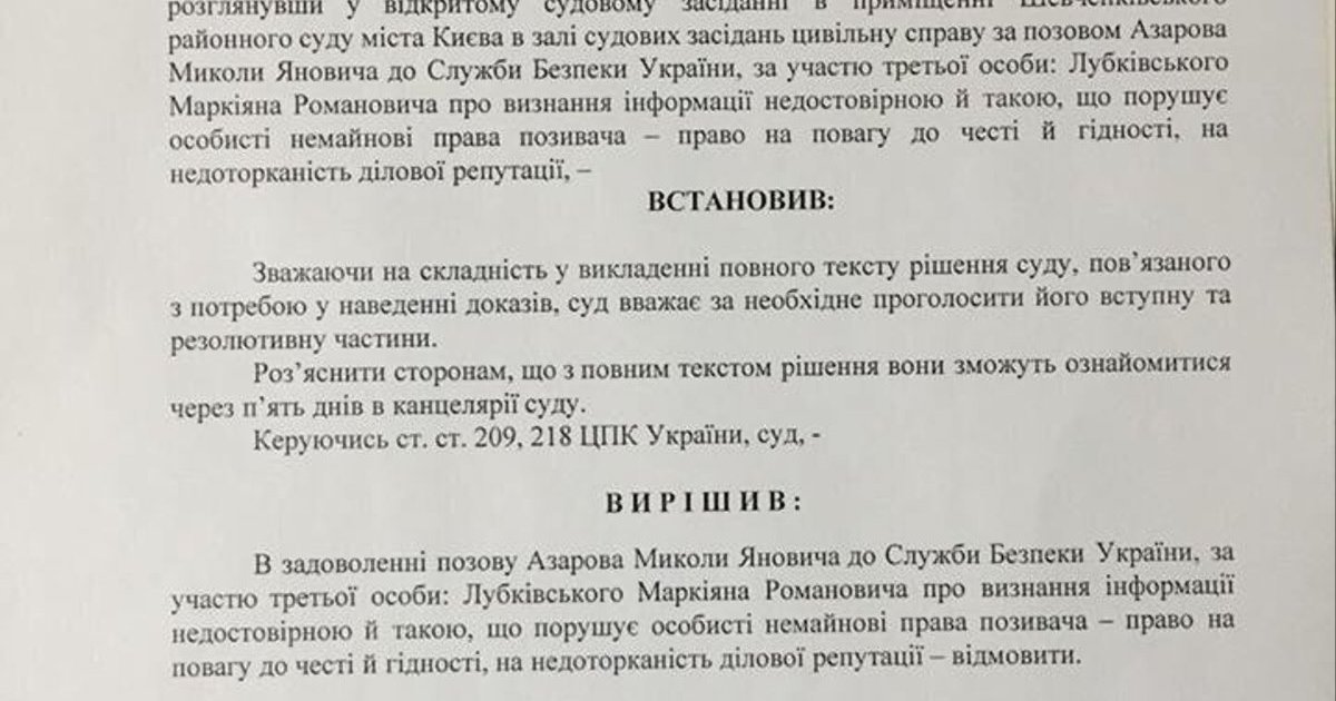 Отметим, что в указанном решении Шевченковского райсуда говорится: "В удовлетворении иска Азарова Николая Яновича к СБУ с участием третьего лица: Лубкивского Маркияна Романовича о признании информации недостоверной и такой, которая нарушает личные неимущественные права заявителя - право на уважение чести и достоинства, на неприкосновенность деловой репутации - отказать".