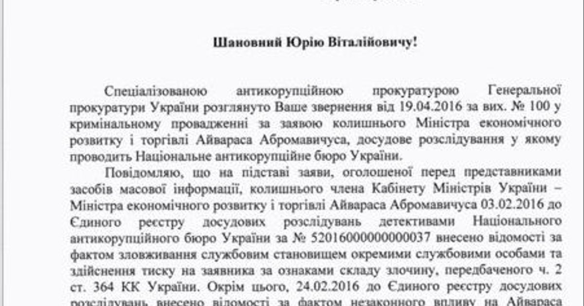 Согласно письму, для проверки других обстоятельств, указанных Абромавичусом, при которых, по его мнению, на него оказывали давление другие лица, препятствуя заниматься служебной деятельностью, выделено уголовное производство, о чем 26.03.2016 внесены сведения в Единый реестр досудебных расследований по №52016000000000084, досудебное расследование в котором проводят детективы НАБУ по признакам состава преступления, предусмотренного ч. 2 ст. 364 УК Украины (злоупотребление властью или служебным положением). Досудебное расследование продолжается.