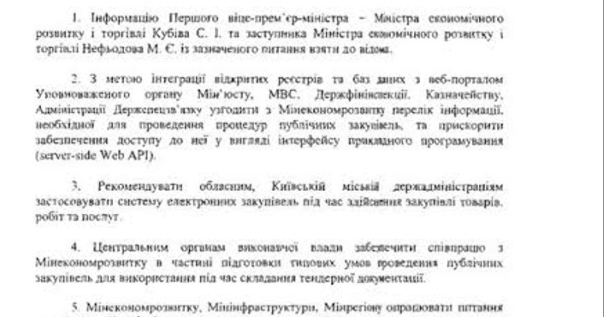 "Минэкономразвития вместе с Днепропетровской облгосадминистрацией организовать и провести обучение с представителями ОГА и органами местного самоуправления с учетом результатов внедрения ими системы электронных закупок", - говорится в Протоколе КМУ.
